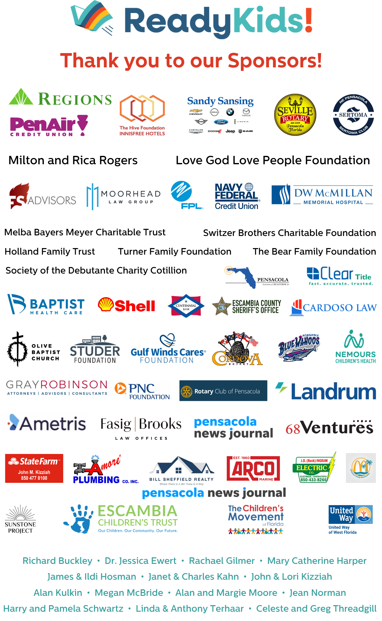 ReadyKids! began in 2007 with a vision from Pensacola leaders to create meaningful and outcome-driven initiatives that support our children at the start of their academic journeys. ReadyKids! continues to grow, thrive, and advance thanks to the support of community stakeholders coming together for a shared vision that, one day, every child in Escambia County will start school ready to learn. Our work is possible thanks to each and every one of our sponsors, partners, and supporters. Thank you!